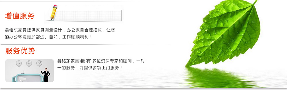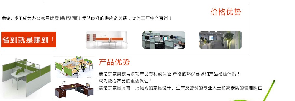 深圳市鑫銘東家具有限公司專業(yè)銷售各類辦公家具!產(chǎn)品涉及多種系列,如:班臺、班椅、屏風(fēng)、會議桌、會議椅、辦公沙發(fā)、茶幾、辦公桌、文件柜、電腦桌椅、各式餐臺、餐椅、書柜等辦公家具。 鑫銘東家具擁有一批優(yōu)秀的家具設(shè)計、生產(chǎn)及營銷的專業(yè)人士和高素質(zhì)的管理隊伍。銘東家具以"先難后易"之戰(zhàn)略,在產(chǎn)品結(jié)構(gòu)、產(chǎn)品質(zhì)量及服務(wù)水平方面,均推陳出新,力求完善,精益求精。使我們的產(chǎn)品質(zhì)量保持在國內(nèi)外家具潮流的先進(jìn)水平,力求滿足客戶的特殊需求。鑫銘東家具多年來致力于環(huán)保、實(shí)用家具的設(shè)計與開發(fā),集生產(chǎn)、銷售、服務(wù)于一體。本著"以人為本"的設(shè)計理念,大量開發(fā)符合人體工程學(xué)的各種產(chǎn)品,以"誠信為本"的質(zhì)量方針,真材實(shí)料,認(rèn)認(rèn)真真做產(chǎn)品,實(shí)實(shí)在在做人。鑫銘東家具更致力于創(chuàng)造"零維修率"的制造境界,實(shí)現(xiàn)"沒有維修的服務(wù)才是最好服務(wù)"的口號》了解更多